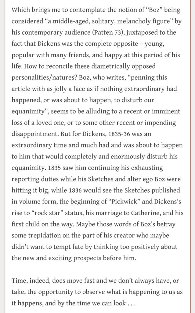We’ve been struck by “The New Year,” and it’s narrative structure. Lenny has been particularly fascinated with this, and of Boz’s characterization of himself. Is he a middle-aged or elderly introvert, a passive spectator? This is seemingly so at odds with the lively, vibrant, enviably youthful Dickens at the time of his writing of the Sketches. Here is a rich passage from Lenny’s comments on the subject: