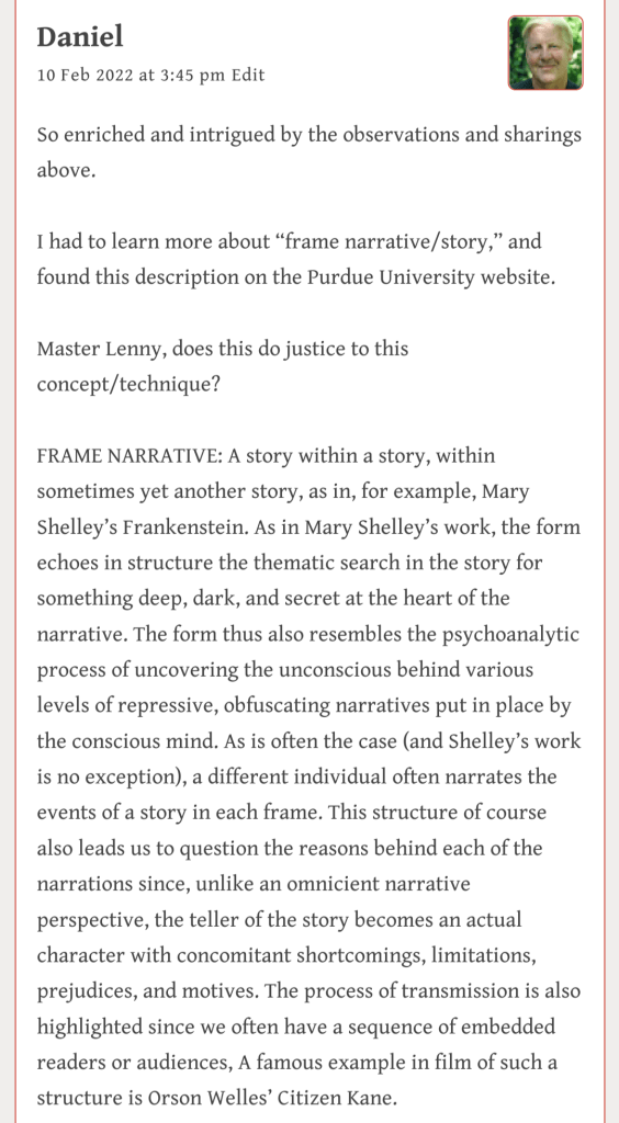 In considering Dickens’ writing, his use of “frame narrative” and his lengthy sentences with such layers and a detailed, “visual” feast of words, Daniel shares a fascinating quote: