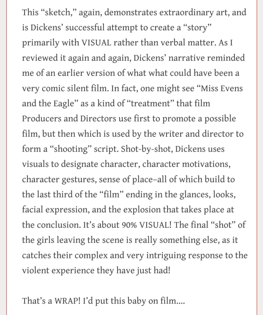 And not only that, but the strikingly visual quality to many of Dickens’ Sketches, notably this week with “Miss Evans.” Lenny is ready to have this filmed!