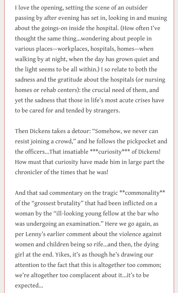 More evidence of the consuming quality of the reader’s experience in reading Dickens was discussed in “The Hospital Patient” and Boz’s ability to create atmosphere, and to wake us up to the too-common realities of loneliness, loss, and violence: