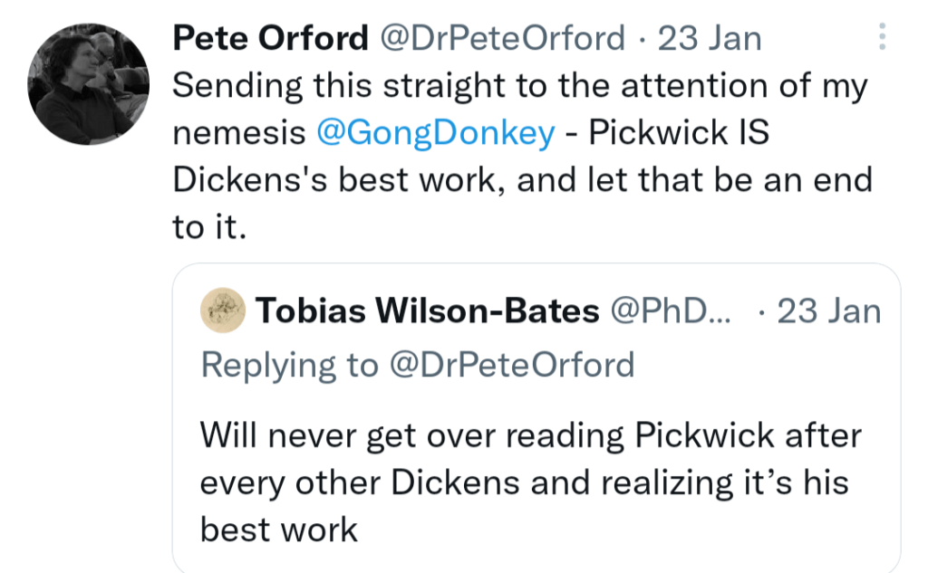 Absolutely sobbing at the tweet about “reading Pickwick after every other Dickens novel and realizing it’s his best work.” IT’S TRUE. The sheer exuberance of this book is hard to match.
