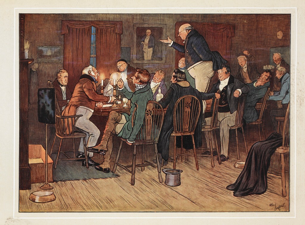 “The first ray of light which illumines the gloom, and converts into a dazzling brilliancy that obscurity in which the earlier history of the public career of the immortal Pickwick would appear to be involved, is derived from the perusal of the following entry in the Transactions of the Pickwick Club…”