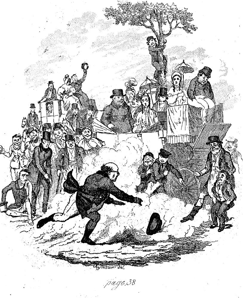 Dickens was still making a name for himself ~ mostly under the pen name, Boz ~ at the time when the publishers Chapman and Hall proposed that he write a longer work to accompany Robert Seymour’s illustrations. (Note that, originally, the main attraction was the illustrations.) Dr. Christian Lehmann says in the video shared below that the text is supposed to have been “a narrative that gets you from picture to picture.” Peter Ackroyd writes that Chapman and Hall looked to “repeat the success” they had had the previous year in their Squib Annual of Poetry, Politics, and Personalities, “which was more or less a vehicle for the cartoons of Robert Seymour.” Seymour wanted a writer to portray the adventures and misadventures of a certain “Nimrod Club” of unsporty sportsmen; Dickens, who had had a different notion and was not much interested in the idea proposed to him, ultimately kept the proposed theme alive in only one of the characters, Mr. Winkle, the “sportsman” who can as little ride a horse or shoot a rifle as he can play a less dangerous sport.
