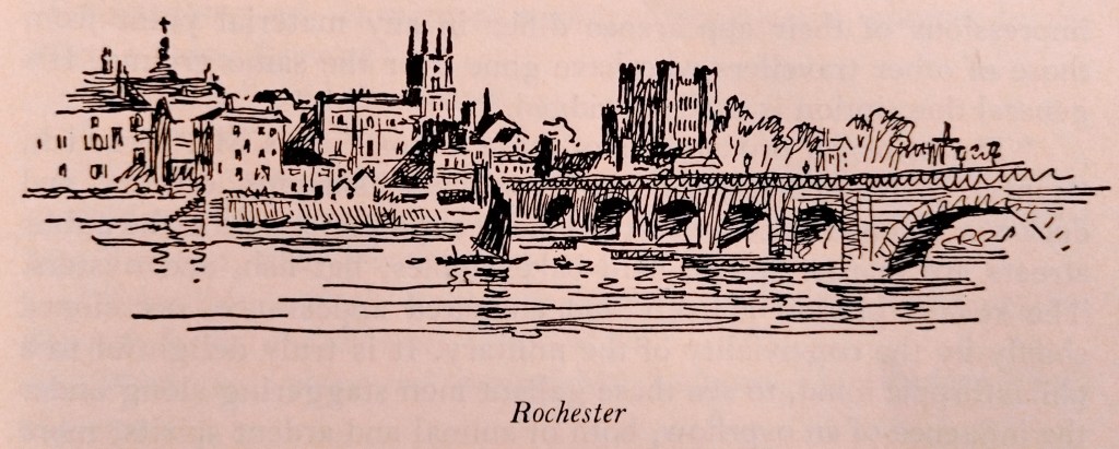 Interesting that both of the first 2 chapters start out with the image of light/the rising sun. (And how, during Winkle’s near-duel, he notices the sun going down, and considers that he himself is about to go down with it…) But the light references are mostly related to Pickwick himself. Similarly, this wonderful passage, as Pickwick, arriving in Rochester with his friends and Jingle, descends into a drink-heavy stupor: “Like a gas lamp in the street, with the wind in the pipe, he had exhibited for a moment an unnatural brilliancy: then sunk so low as to be scarcely discernible: after a short interval he had burst out again, to enlighten for a moment, then flickered with an uncertain, staggering sort of light, and then gone out altogether.”