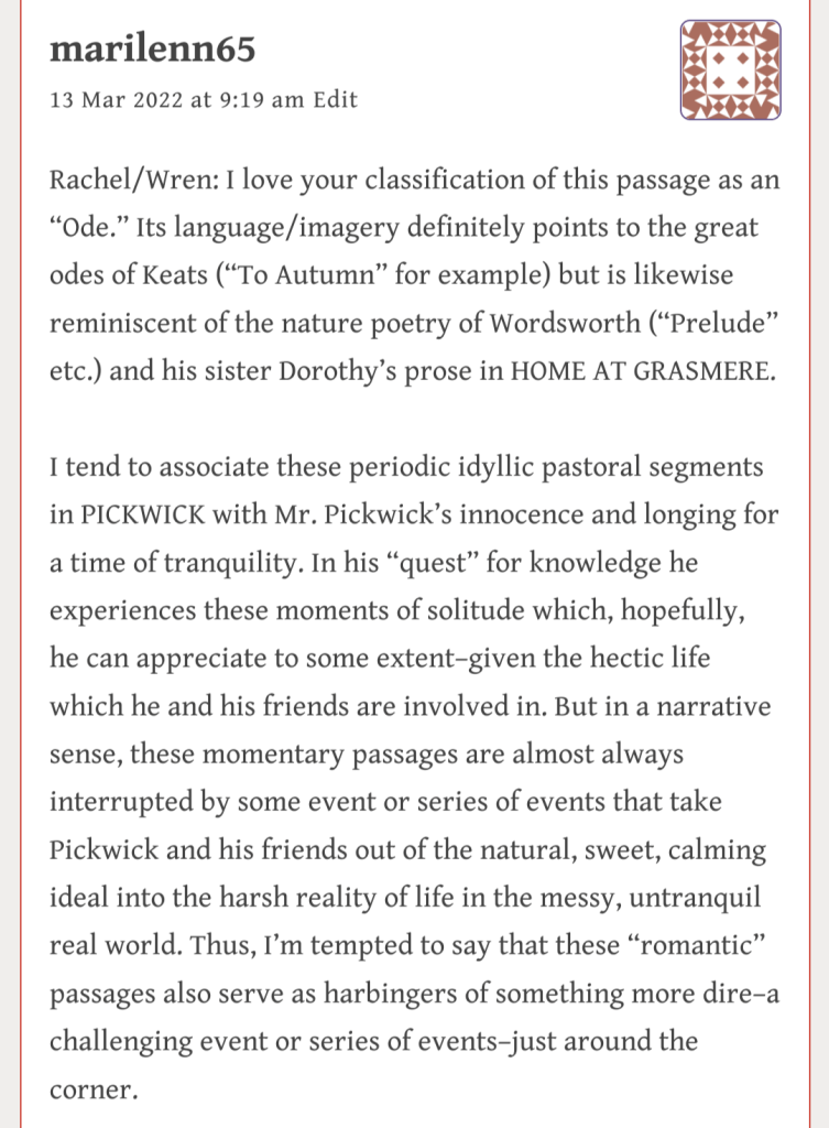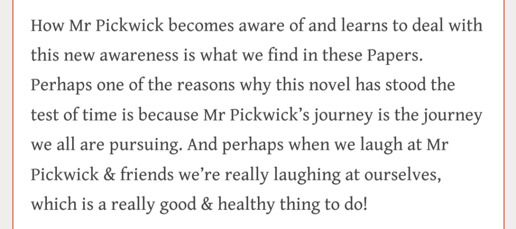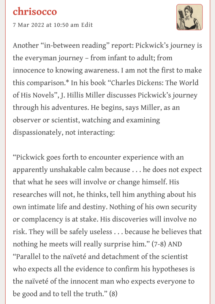 In Chris’ immensely enriching “in-between readings” of Dickens’ critics, with biographical notes and reflections, she writes at length on J.H. Miller and seeing Pickwick’s journey as one from “innocence to knowing awareness.”