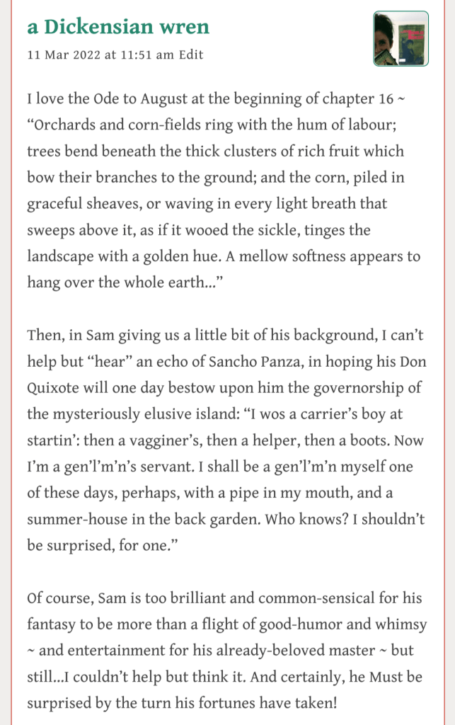 Love the passages you highlight here. Of course, I loved every moment with Sam, and always have a smile on my face (and honestly, a sigh of relief) whenever he comes into “view.” Also, I was remembering the line that Dr Christian said was the one that made him start to love Pickwick: