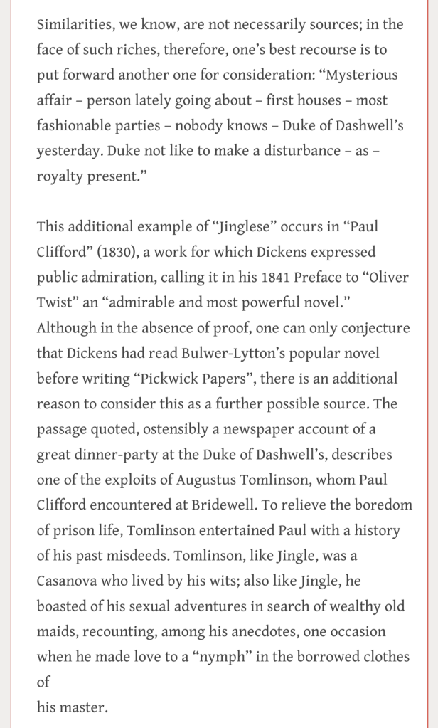 On his question about “Dickens’ method in creating Jingle’s strangely staccatoed speech pattern,” Chris writes: