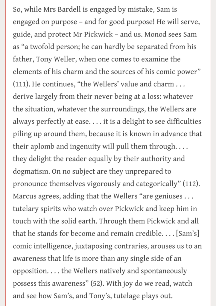 Rach & Lenny — Mr Pickwick at Ipswich – Here we get Sam’s articulation of his mission, assignment, duty, burden, promise (I’m not sure which word is accurate) relative to Mr Pickwick: “You rayther want somebody to look arter you, sir, wen your judgment goes out a wisitin’.” This is what Sam has done and will continue to do for his Master; and he will do it well. You two have hit upon this quite rightly!