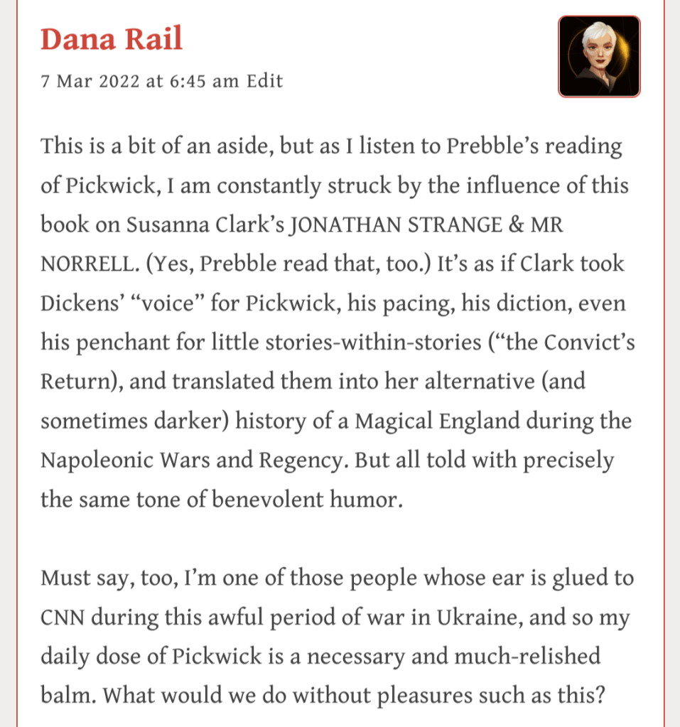 I’ll end with Dana’s lovely comments on Simon Prebble’s masterful reading of Pickwick, and the importance of having a worldview like Dickens’ in such times of world trouble and tragedy. (And when are we not in such times…?)