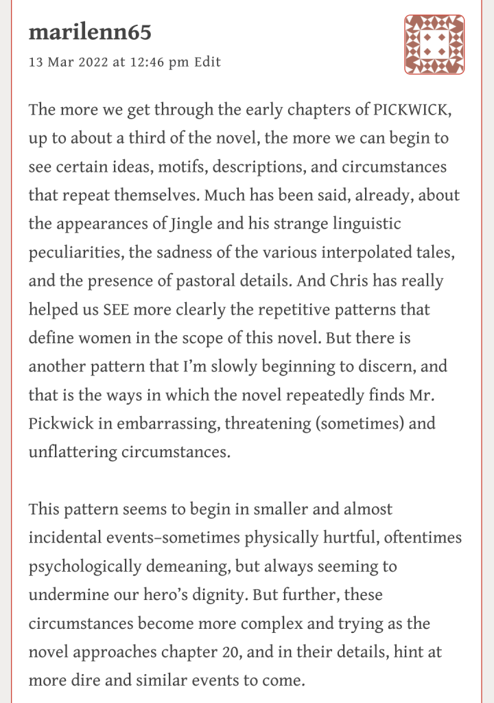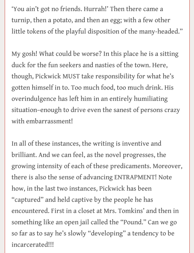 You say earlier that Dickens is “taking charge of his craft though still experimenting” during the composition of PICKWICK. It occurred to me with these intricate changes in narrative voice and subtle shifts in tense that he’s testing (experimenting with) out these writing methods–and doing so successfully!