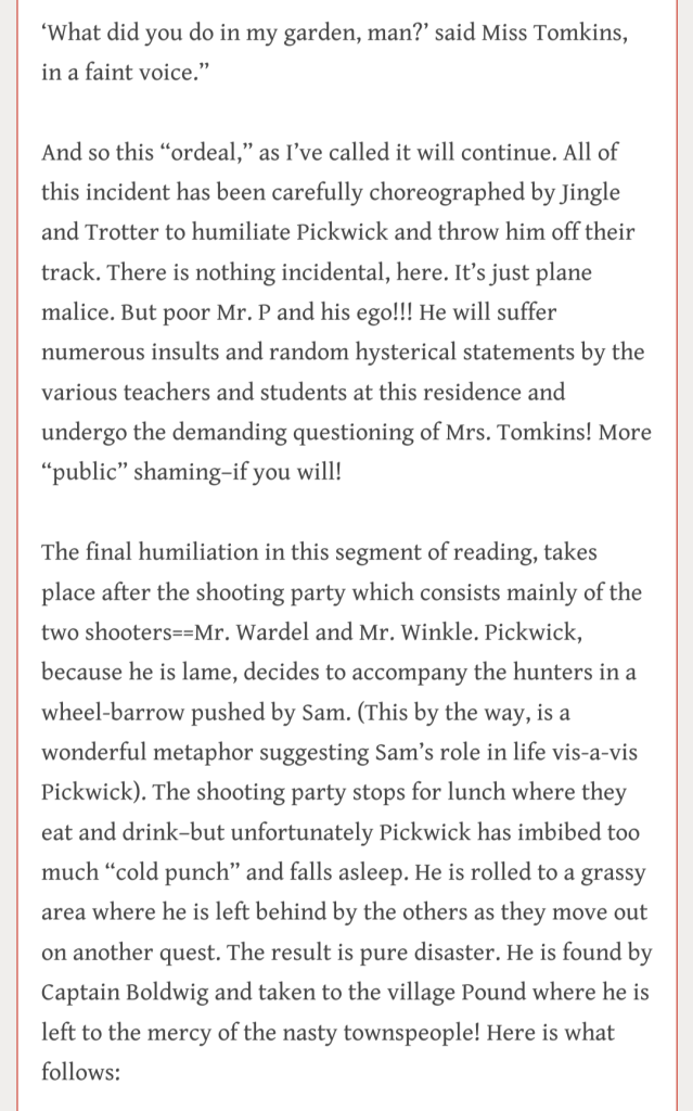 Again, I go back to what Chris mentioned in her remarks a few days ago. She says, oh so beautifully: “Dickens is gathering his tools, manipulating and working them to see how they feel and how best to use them” My belief is that that is exactly what we are seeing in these beginning paragraphs of Chapter 28 of THE PICKWICK PAPERS.