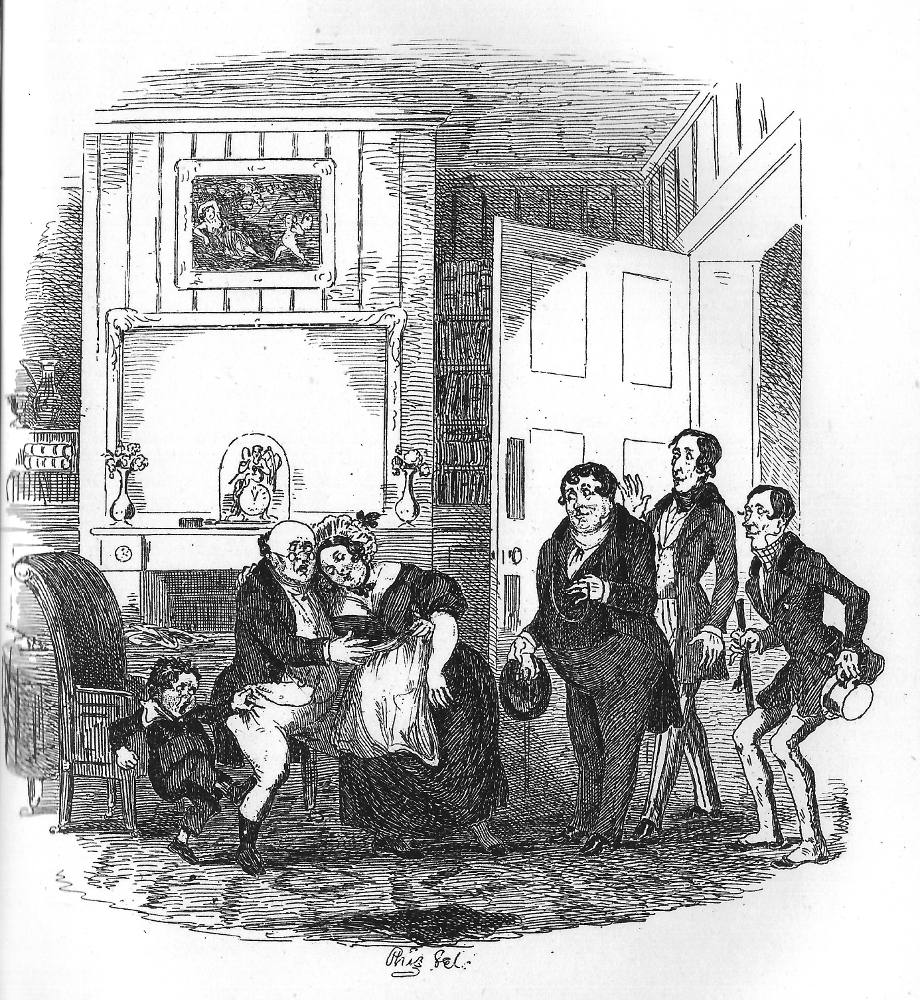 With the assistance of Sam and Mr. Wardle, the situation is rectified, but after some marital melodrama involving Winkle and Mrs. Potts, our Pickwickian friends end up reading with horror the letter from lawyers Dodson and Fogg, about the action in Bardell against Pickwick, for “breach of promise of marriage,” due to the misunderstandings of the conversation and tableau mentioned above, and the “dreadful conjunction of appearances” lamented by Mr. Pickwick.