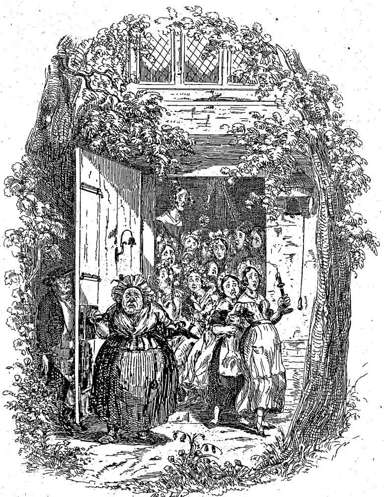 Regarding the interpolated tales – 2 this section, “The Queer Client” and “The Goblins” – Mr Pickwick hears or reads them, but we get little or none of his reaction to them. Does he think about them? How do they affect him? And how do they fit into his journey from innocence to knowledge? I’m searching for insight here, but so far have found little scholarship that answers these questions. I’ll keep looking. Any insight our Reading Club may have will be appreciated. I certainly understand they present the dark side of humanity to Mr Pickwick, giving him pause I should think, and even if he doesn’t consciously consider them he must unconsciously be troubled by how these dark tales relate to “life”, even if he considers them too fantastic. Maybe they are laying the groundwork for him, preparing his mind for pitfalls he may encounter. At any rate, I find the lack of reaction to them as odd. No doubt, “The Story of the Goblins who stole a Sexton” is the germ of “A Christmas Carol”; and Gabriel Grub combined with Nicodemus Dumps of “The Bloomsbury Christening” sketch are prototypes for Ebenezer Scrooge.