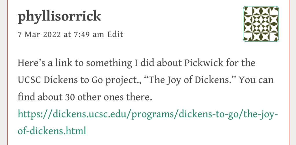 Phyllis has shared a link to a labor of love on her own journey and research into Dickens’ novels, and I for one am eager to learn more! Here is the link to her piece on Pickwick.