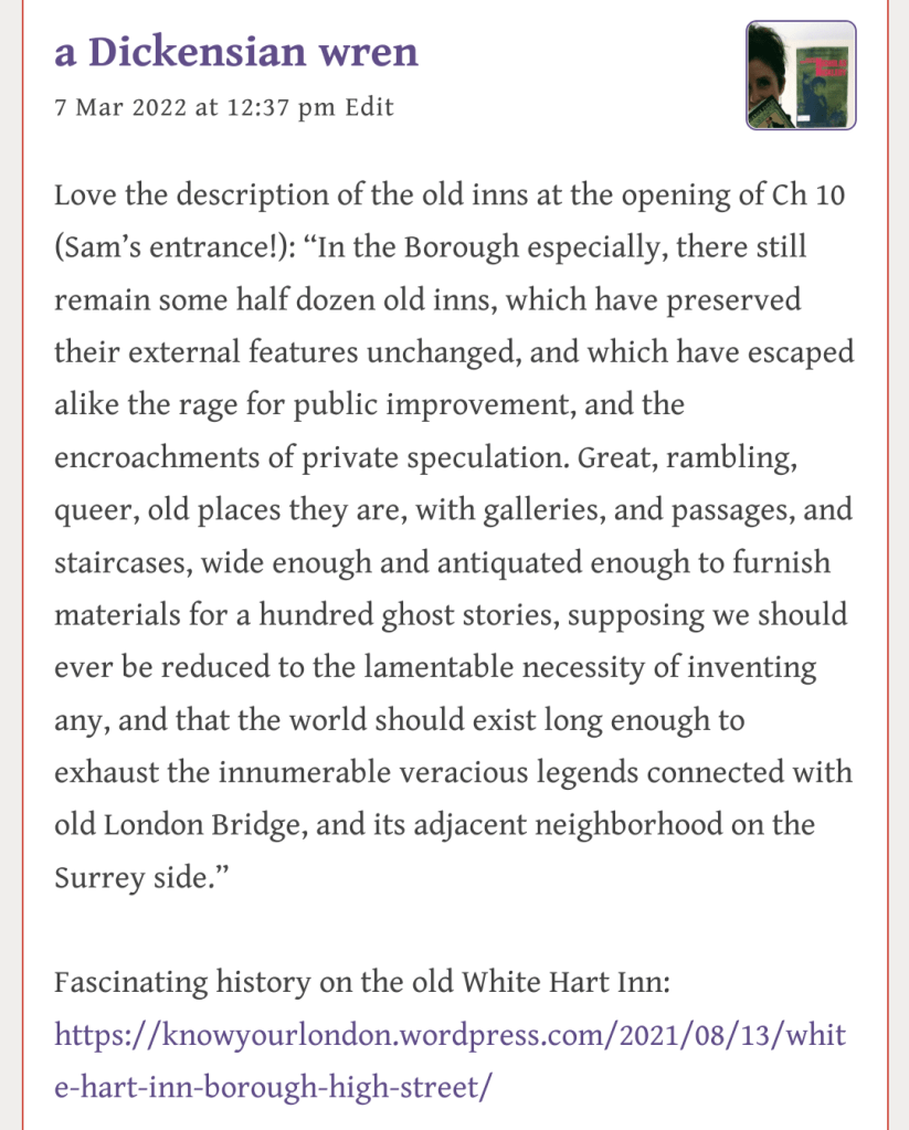 And we had a lively discussion with a variety of levels of engagement, from the whimsical and delighted appreciation of Pickwickian joys, to the exploration of various darker themes, to the sharing of information on London, old and new.