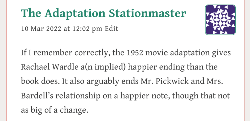 The “Adaptation Stationmaster” mentioned the 1952 adaptation of Pickwick ~ and I’ve been really wanting to see that version. Any additional thoughts, from those who’ve seen it?