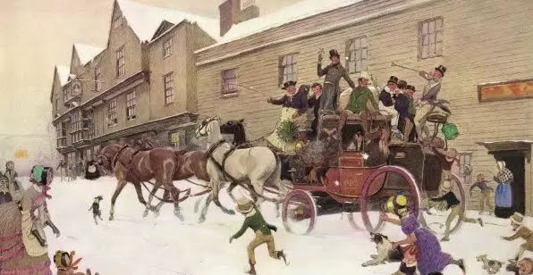 So, then, the novel takes us from the “ideal” to the “real” in just a few chapters. What we thought was going to come to pass HAS come to pass. Mr. Pickwick is now in REAL trouble. But wait, maybe the Christmas Chapter wasn’t all comic festivities, fun and games. there is a key moment when things do go, slightly downhill. Maybe almost mortally so. Mr. Pickwick is on the ice and wants to continue to join in on the fun, and is game to try the “ice slide.” Here, he takes a fall and the metaphor is almost too obvious:
