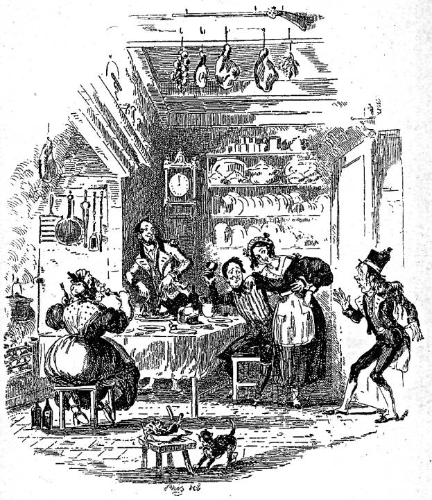 “Job Trotter Encounters Sam in Mr. Muzzle’s Kitchen,” by Phiz. Scanned image and text by Philip V. Allingham; https://victorianweb.org/art/illustration/phiz/pickwick/22.html