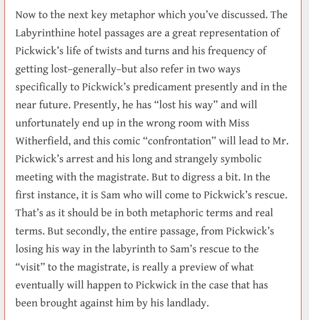 Lenny continues in his response, that Dickens here is writing himself “into a more sophisticated ‘long form’ narrative”: “I’m not sure, precisely when or how this happens….he begins to drop ‘story lines’ that are less congenial to the narrative and that he is now beginning to perceive a more resolute direction for.” The “public humiliations” of Pickwick become a “motif” and “organizing principle”:
