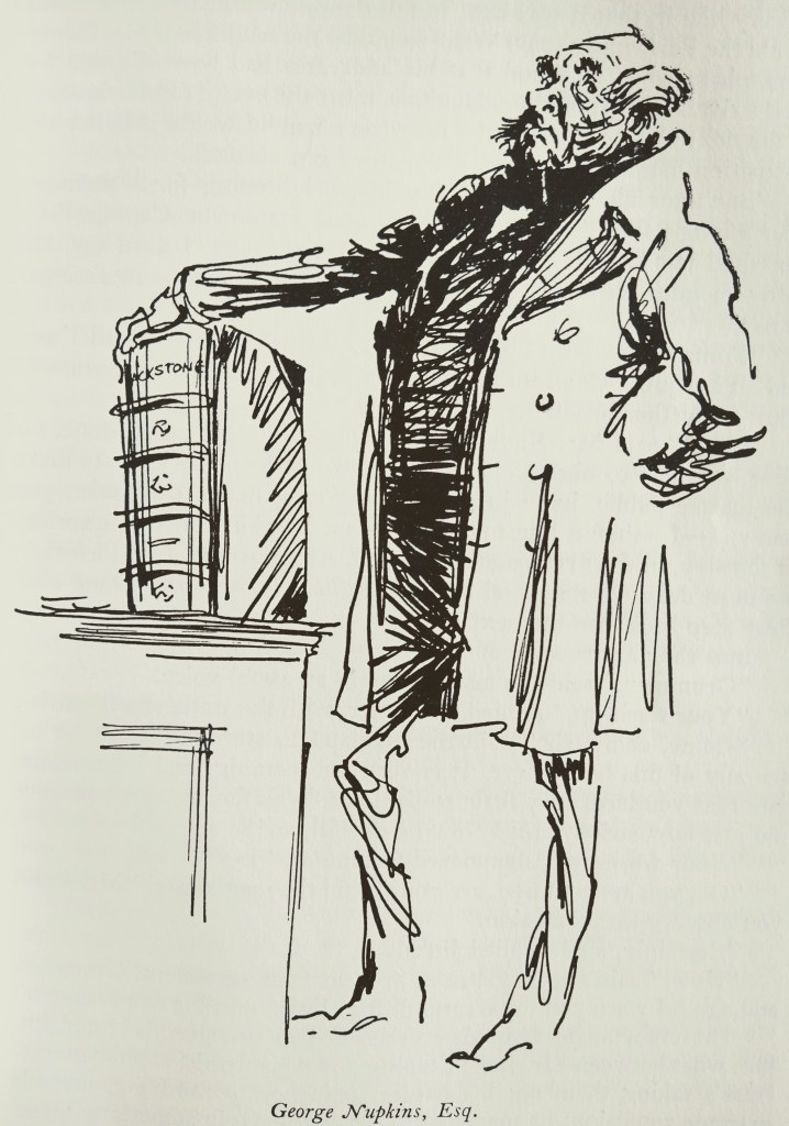 Nupkins lists the charges against them, and is occasionally, Dogberry-like, “too cunning to be understood” (Much Ado About Nothing, V.i). Pickwick asks to speak to Nupkins aside, and Pickwick and Sam relate to him their history with Mr. Jingle, and why they are in Ipswich. This changes everything: Mr. Nupkins has been “harbouring” this “gross impostor,” Jingle, who has been charming the family under an assumed name (Captain Fitz-Marshall) with aristocratic airs and claims of connections, and flattering the daughter, who assumes him to be quite the catch. How will the Nupkins family face their friends, some of whom they have estranged by putting forward this Captain Fitz-Marshall?