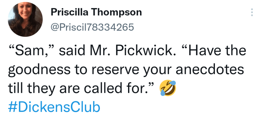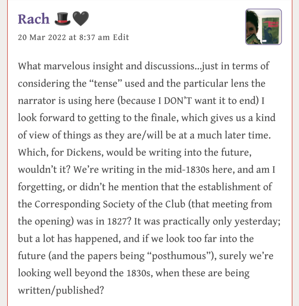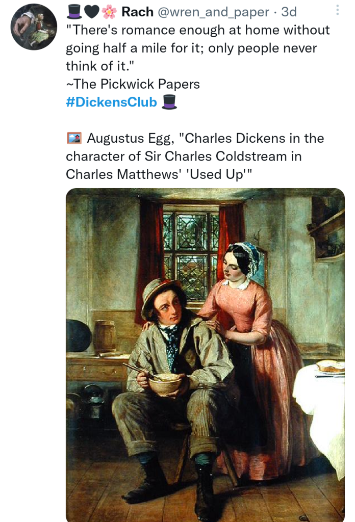 If you’re counting, this coming week will be week 12 of the #DickensClub as a whole (and today Day 77), and Week 4 of The Pickwick Papers (our second read). Please feel free to comment below this post for the fourth week’s chapters, or to use the hashtag #DickensClub if you’re commenting on twitter.