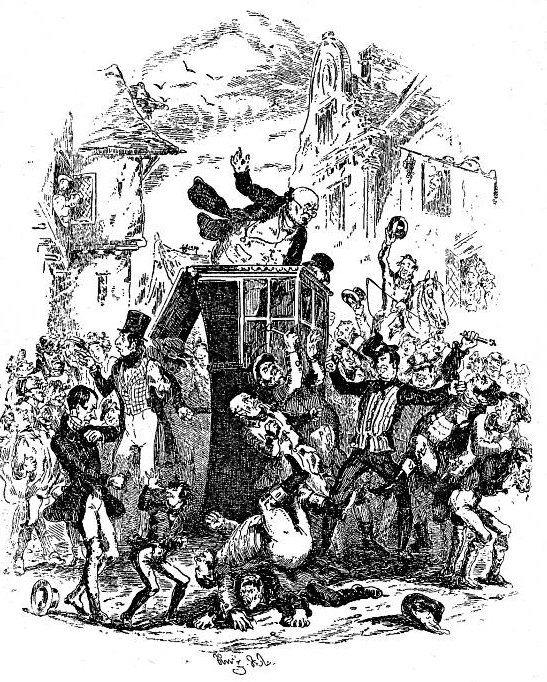 “Mr. Weller Attacks the Executive of Ipswich,” by Phiz. Scanned image and text by Philip V. Allingham; https://victorianweb.org/art/illustration/phiz/pickwick/21.html