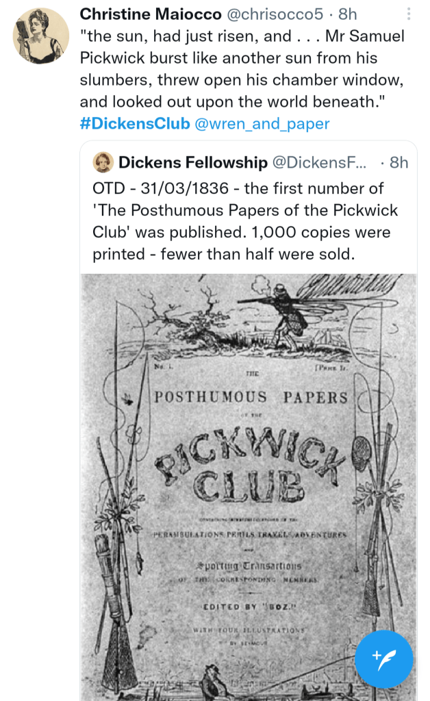 Before I go into our week’s summary, just two quick notes/reminders, thanks to Chris! Firstly, we just had the anniversary of the publication of the first installment of Pickwick, on 30 March (1836)!