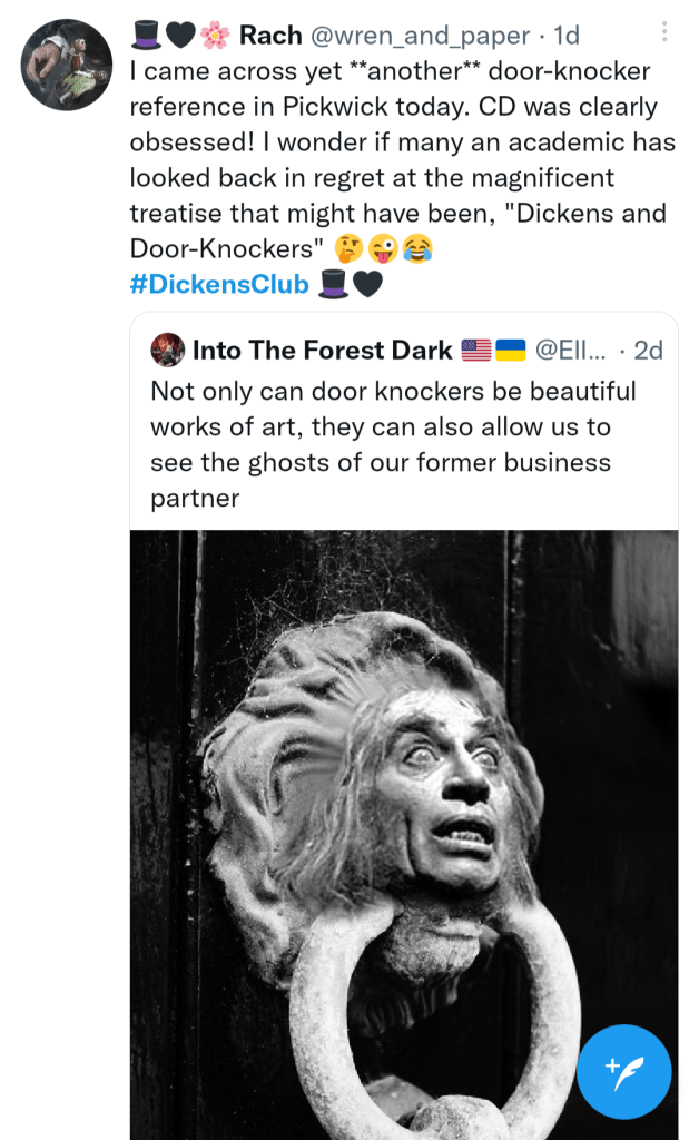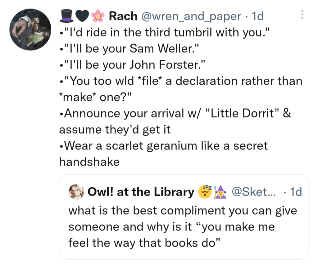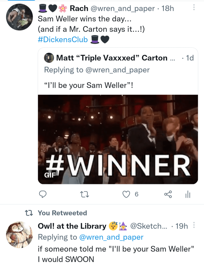 For another bit of whimsy, I’d responded on twitter to a comment of Boze’s, on the best possible compliments which could be paid to someone (all Dickensian, of course!), and clearly the proposal, “I’ll be your Sam Weller” wins the day ~ we have that from Boze, and from Matt Carton (who had allowed me to use his full name, because I couldn’t resist!). Here’s a bit of fun ~ click on each to enlarge: