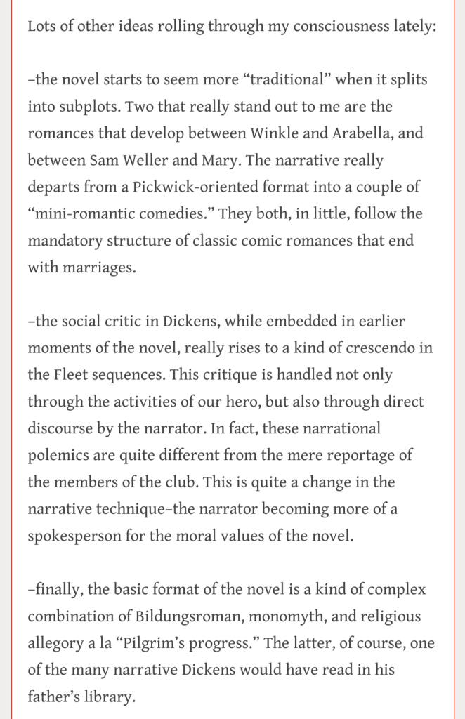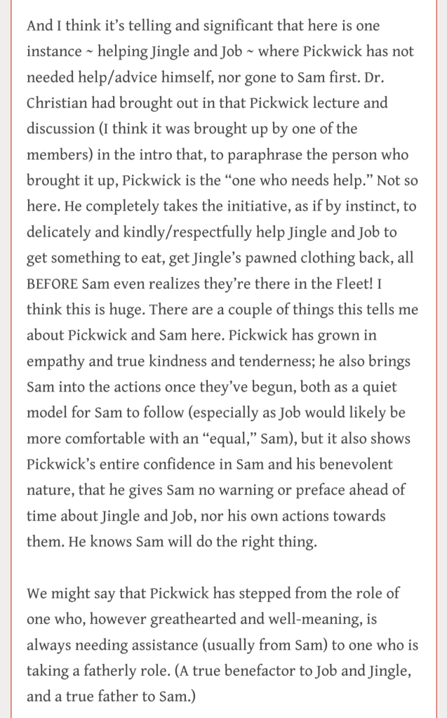 And though I’ll put his whole reflection in full below, I highlight here a piece from Lenny, on how Mr. Pickwick “is becoming more of an actor rather than one who is solely being acted against,” and even emerges as “a kind of St. Francis of the Fleet”: