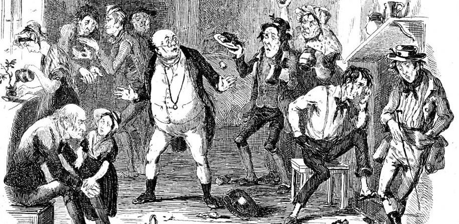 “The elder Mr. Weller, who still continued to make various strange and uncouth attempts to appear asleep, offered not a single word during these proceedings; but when Stiggins stopped for breath, he darted upon him, and snatching the tumbler from his hand, threw the remainder of the rum-and-water in his face, and the glass itself into the grate. Then, seizing the reverend gentleman firmly by the collar, he suddenly fell to kicking him most furiously, accompanying every application of his top-boot to Mr. Stiggins’s person, with sundry violent and incoherent anathemas upon his limbs, eyes, and body.