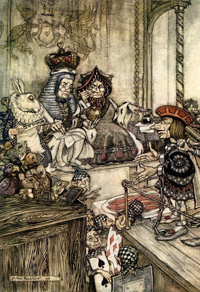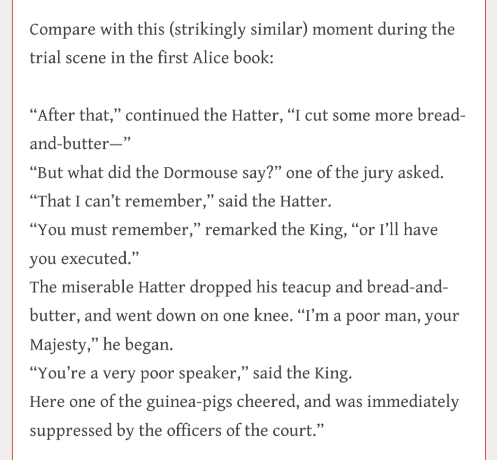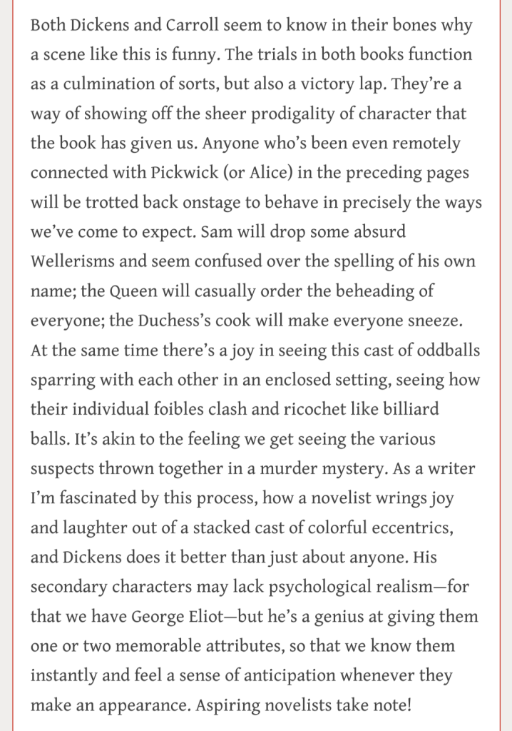 “The trials in both books function as a culmination of sorts, but also a victory lap. They’re a way of showing off the sheer prodigality of character that the book has given us. Anyone who’s been even remotely connected with Pickwick (or Alice) in the preceding pages will be trotted back onstage to behave in precisely the ways we’ve come to expect. Sam will drop some absurd Wellerisms and seem confused over the spelling of his own name; the Queen will casually order the beheading of everyone; the Duchess’s cook will make everyone sneeze. At the same time there’s a joy in seeing this cast of oddballs sparring with each other in an enclosed setting, seeing how their individual foibles clash and ricochet like billiard balls. It’s akin to the feeling we get seeing the various suspects thrown together in a murder mystery.”