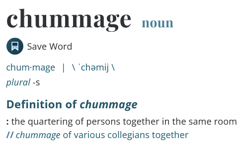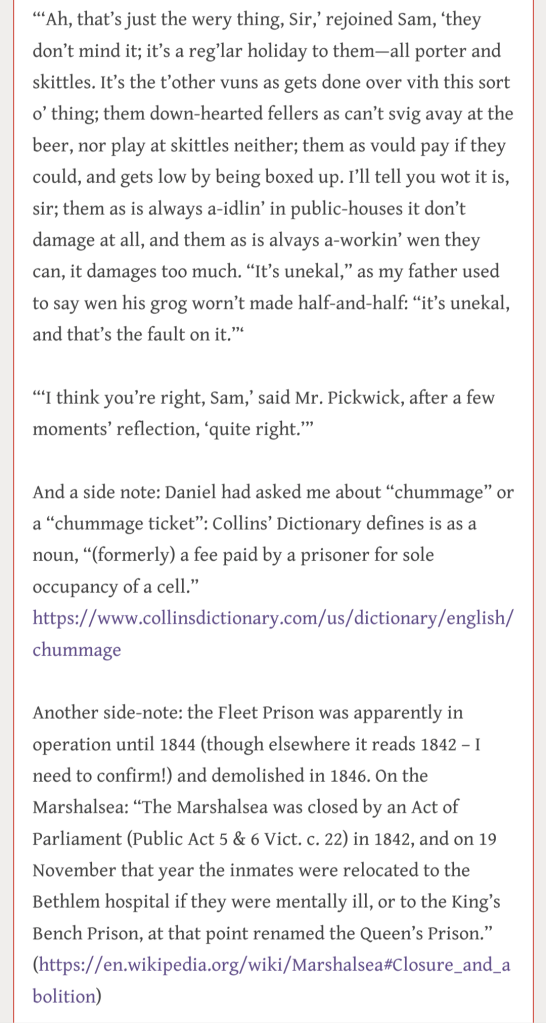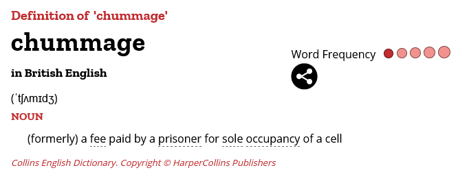 Side note: Daniel had asked about the meaning of “chummage,” and it appears to have a couple of meanings (shown below from Merriam-Webster on the left and Collins Dictionary on the right), but it would appear that the way it is used in the context is the latter: a fee paid by a prisoner for sole occupancy of a cell. Click on each image to enlarge: