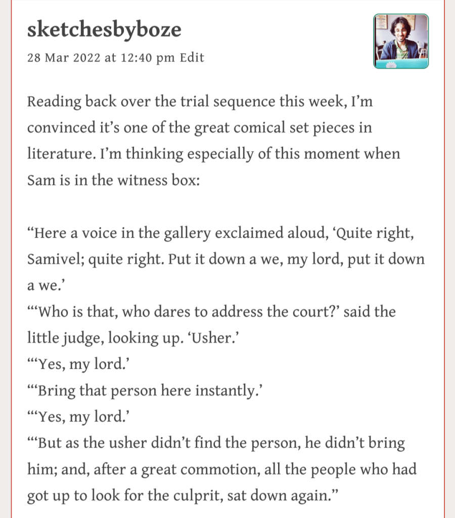 Boze does a brilliant comparison of two trial scenes, Bardell v. Pickwick and the trial scene in Lewis Carroll’s Alice in Wonderland. Here is a writer’s analysis of why this works for some crowd-pleasing comedy: