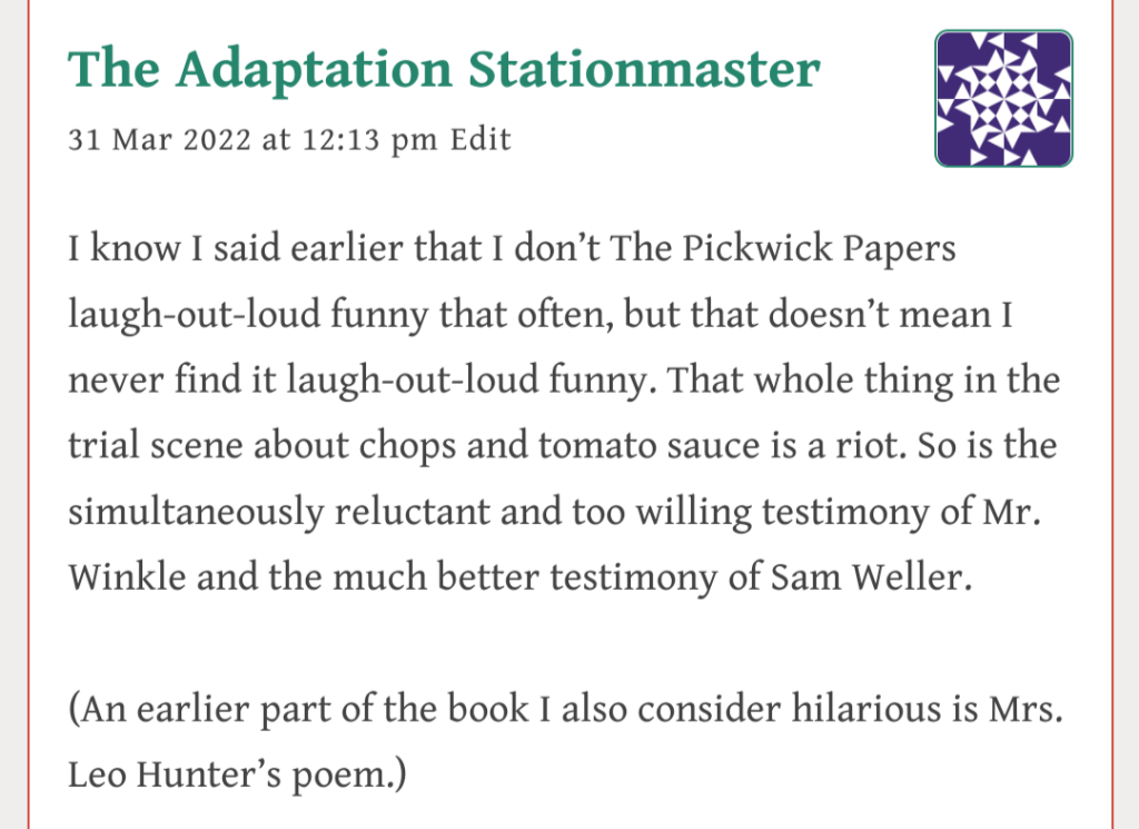 The Adaptation Stationmaster, while not being a huge fan of Pickwick & its comedy, notes some particularly fun and hilarious sequences.