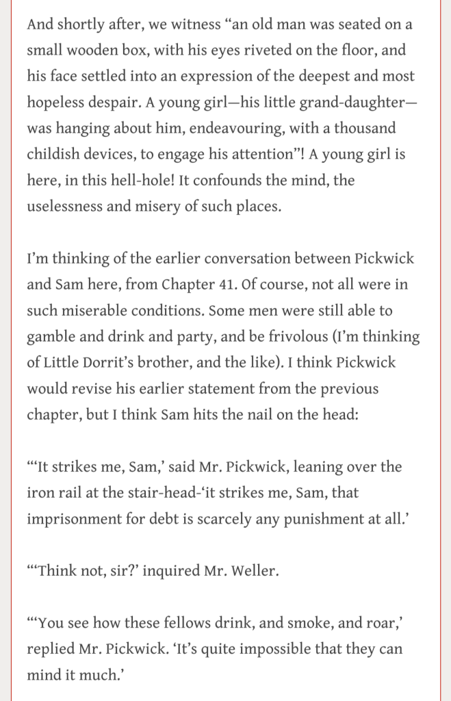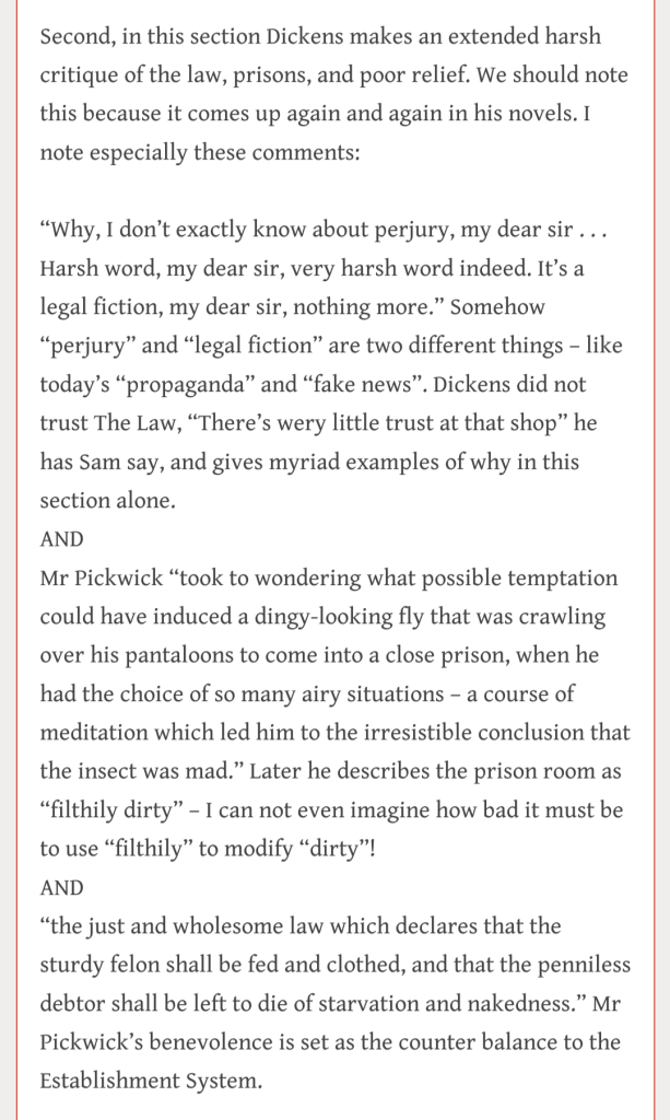 “In this section,” Chris writes, “Dickens makes an extended harsh critique of the law, prisons, and poor relief.” Here’s her reflection on the sections of special note: