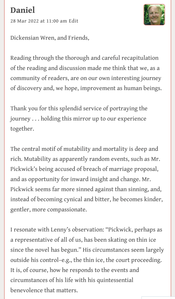Also, Chris gave us a timely reminder about the context of Dickens’ life during this week’s compositions. Both Pickwick and Oliver were delayed in publication, due to one of the most heartbreaking and significant losses of Dickens’ life, which we haven’t really touched on to any degree since the Introduction to The Pickwick Papers. Here’s Chris’ comment: