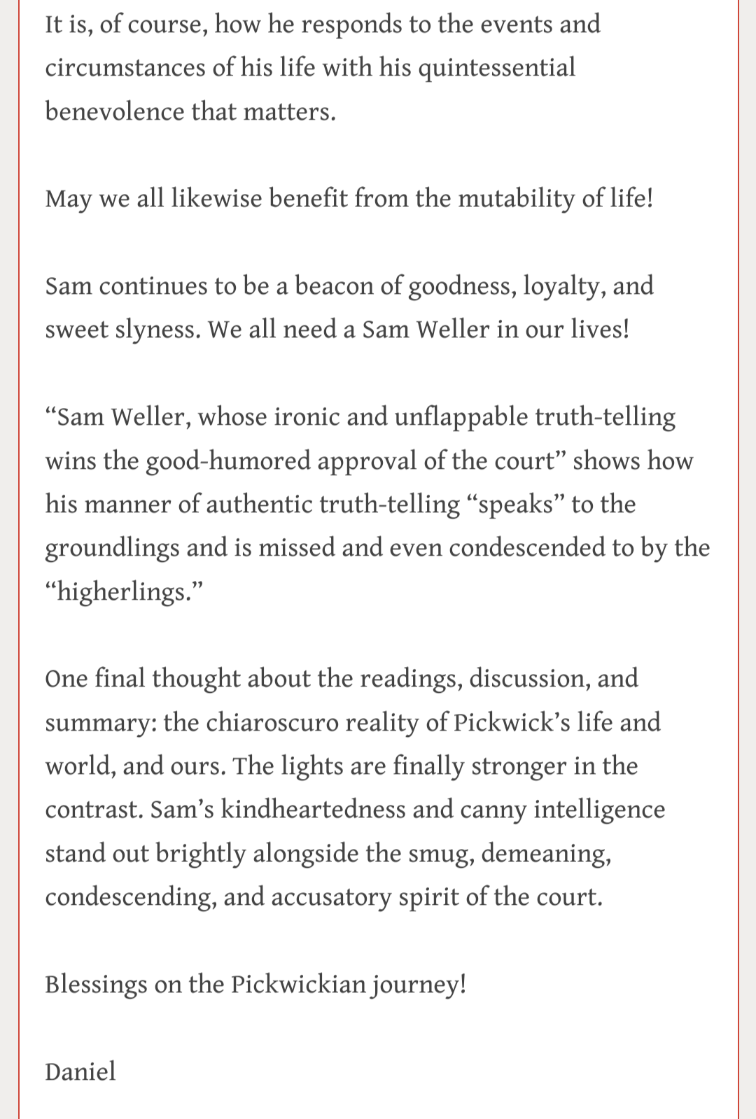 I believe several of us are reluctant to reflect that this is to be our final week with our Pickwickian friends…at least, on this go-round. Certainly, Boze and I were discussing this. (How time flies…!)