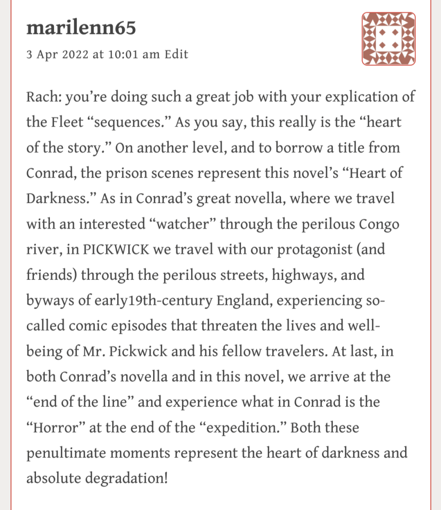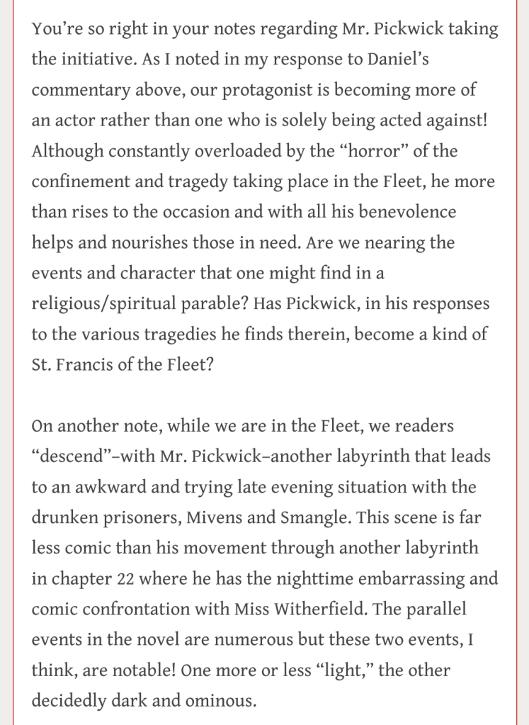 “You’re so right in your notes regarding Mr. Pickwick taking the initiative. As I noted in my response to Daniel’s commentary above, our protagonist is becoming more of an actor rather than one who is solely being acted against! Although constantly overloaded by the “horror” of the confinement and tragedy taking place in the Fleet, he more than rises to the occasion and with all his benevolence helps and nourishes those in need. Are we nearing the events and character that one might find in a religious/spiritual parable? Has Pickwick, in his responses to the various tragedies he finds therein, become a kind of St. Francis of the Fleet?”
