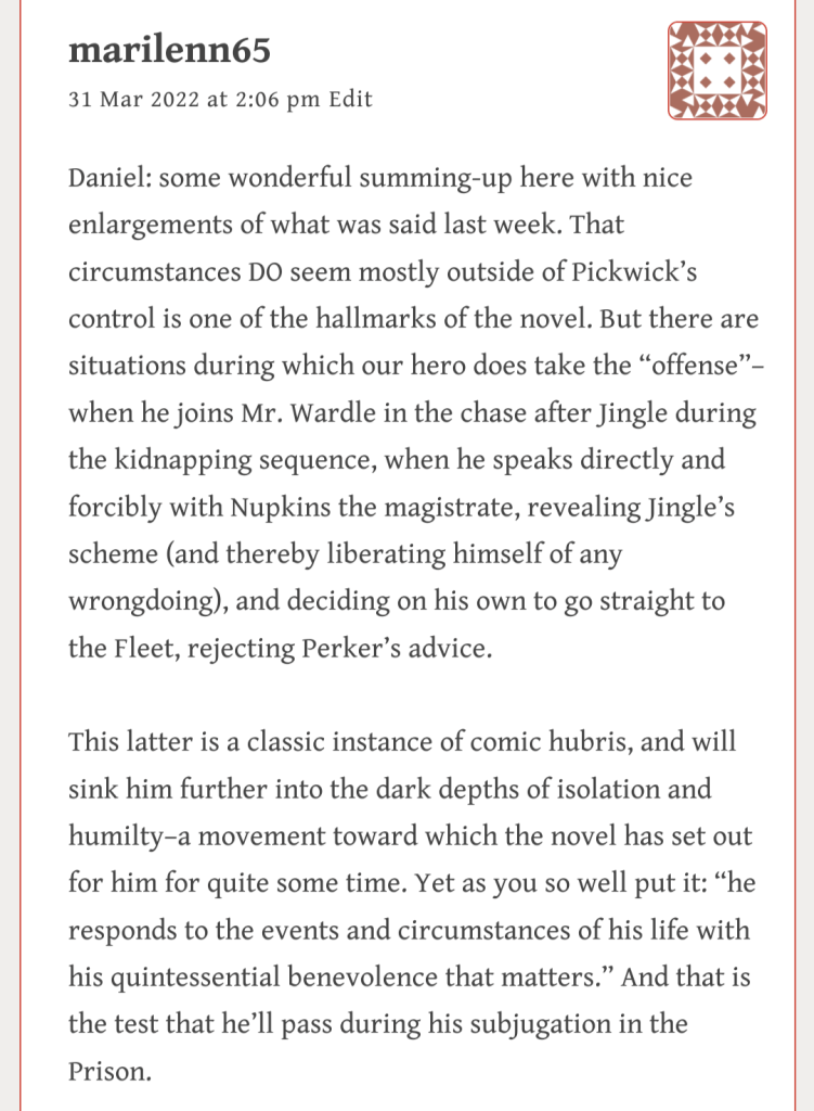 And Lenny responds, agreeing with the summation and exploration, with the addition that, while there are many circumstances beyond Pickwick’s control, he’s also often taking the “offense,” with more than one “instance of comic hubris”: