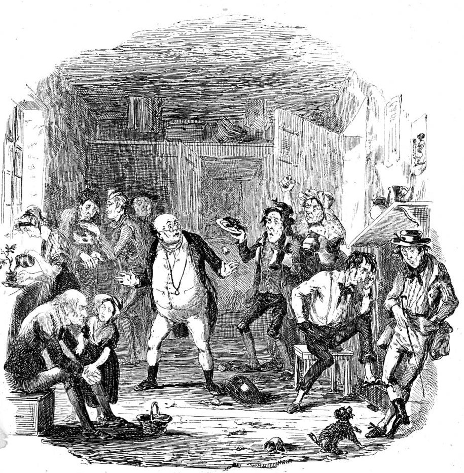 Then there is the kind of violence that we might term “violence born of professional and political competition.” And Chris makes brief reference to this above, when Potts and Slurk get into it, with our horrified hero stuck between them, trying to separate the two adversaries. The real victim, of course, becomes Mr. Pickwick, who is hammered right and left by these two idiot political and journalistic rivals. But it’s also here, where we have that public display of avid watchers, as the others in the room take great joy in the antics of these two combatants, even though their “benevolent” friend Mr. Pickwick is caught in the middle.