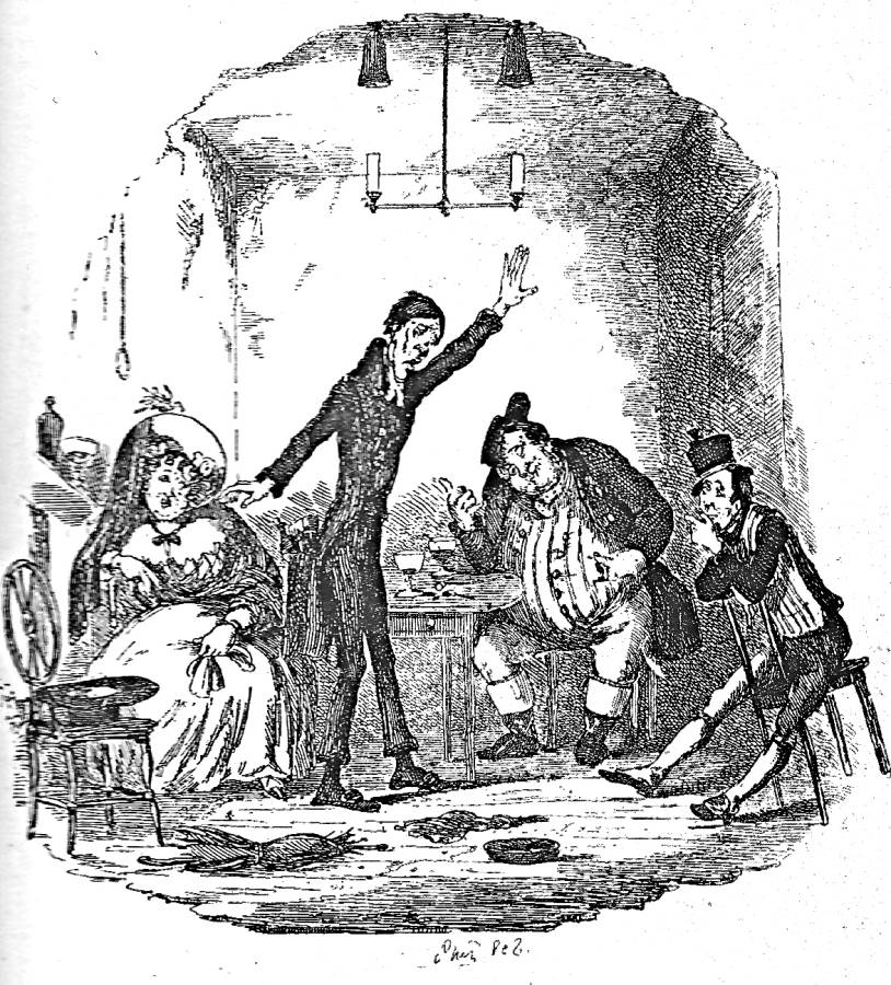 Let me give another example of “violent behavior” that absolutely “floored me” when I read it. Bob Sawyer and his friend Ben Allen are having a very tough time of it, are well into their “cups” (as usual), and come to the topic of Arabella Allen and the possibility that she is being courted by some unknow usurper who would stand in the way of Arabella’s marrying Bob. The discussion, then comes to this sad moment which we could probably term “theoretical violence”: