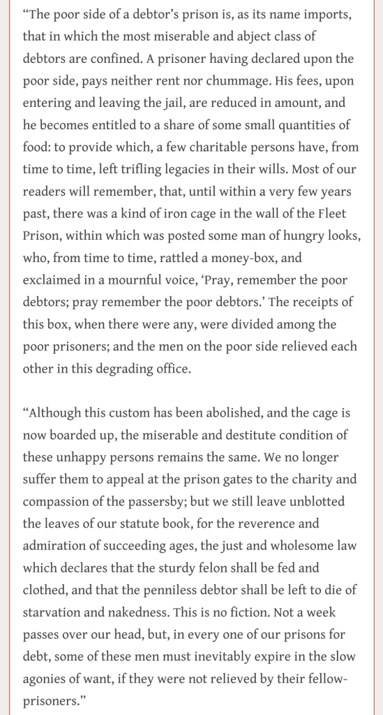 I was reflecting on the passages from our read this week (during what Lenny later calls Pickwick’s “descent” into a kind of Heart of Darkness within London), particularly as we go from the more visible side of the Fleet ~ the idle debtors gambling and drinking the time away, to the “poor side,” where misery and want are most extreme. I start out with an extended quote about the “poor side”:
