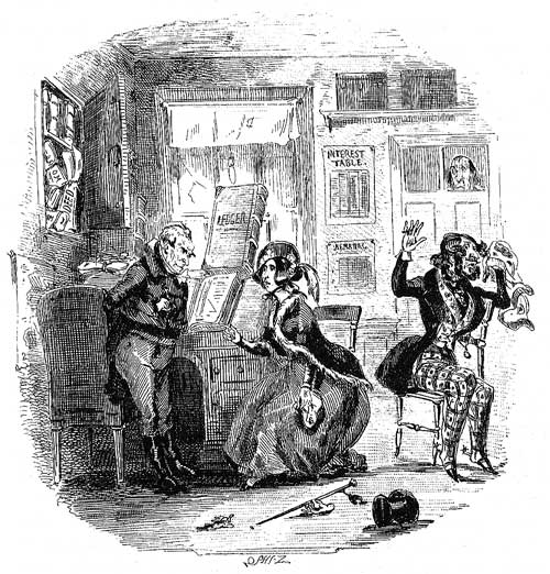 During Mr. Mantalini’s visit to Ralph Nickleby to secure another loan—and during which Mantalini once again woos his wife out of her resolve to give him the cold shoulder and put him on a fixed allowance—Ralph is made aware of the incident at the coffee-house between Hawk and Nicholas. Ralph is then visited by Squeers who is in town, and a plan begins to form in Ralph’s mind about how to wound Nicholas “through his own affections and fancies–. If I could strike him through this boy—”