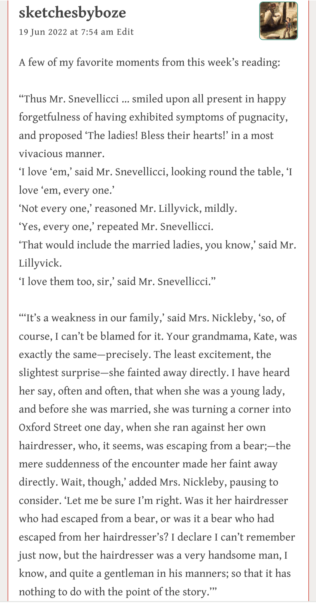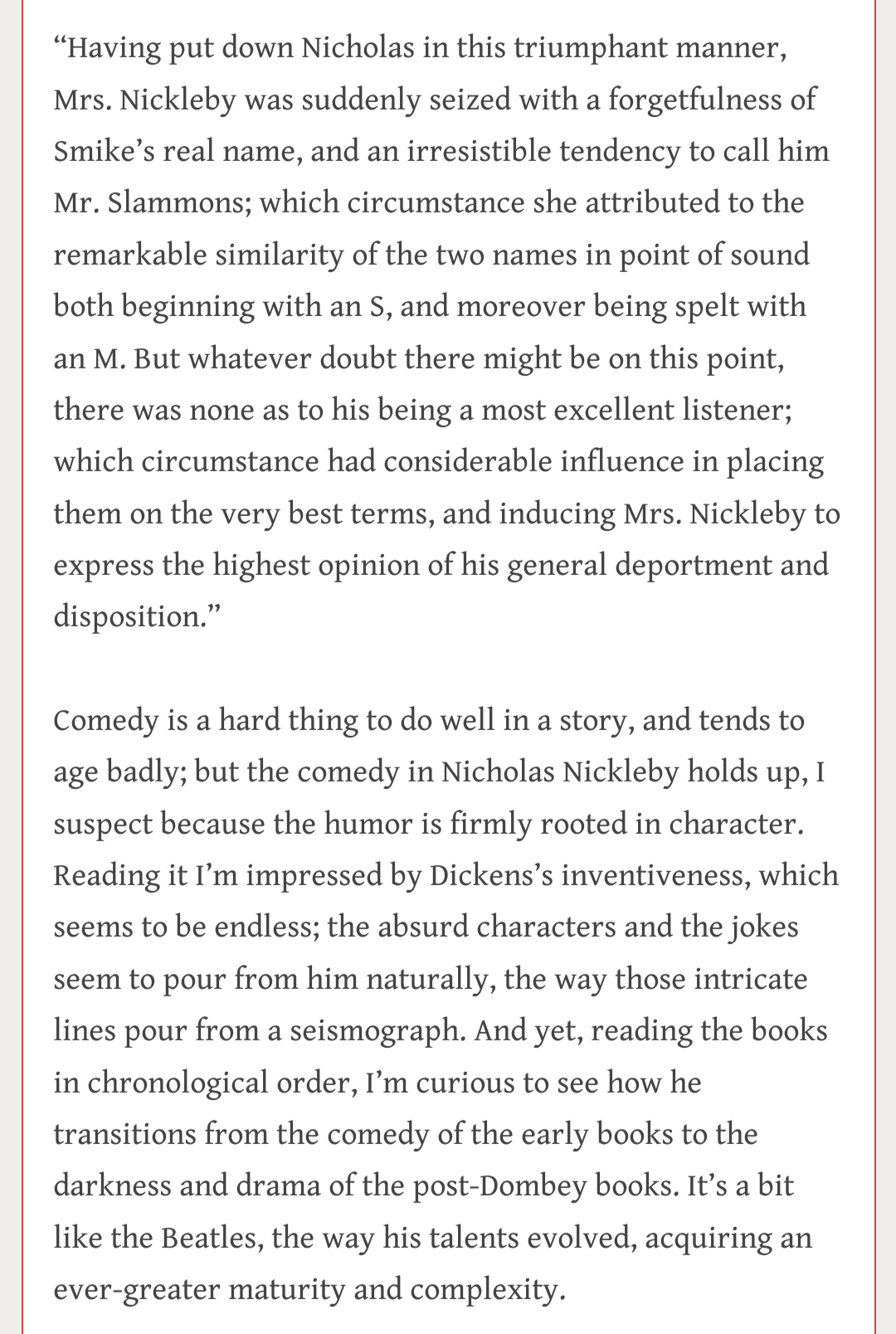 “Comedy is a hard thing to do well in a story, and tends to age badly,” Boze writes. Why does Nicholas Nickleby hold up? Boze gives his thoughts, and favorite passages from the week: