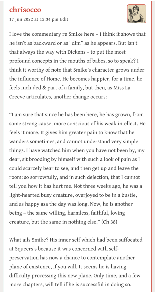 Another marvelous week for discussion, friends! Between the comments on our previous week’s wrap-up post and Marnie’s Nickleby diary of the week, we had two separate threads of discussion happening, and I hope you have time to read them in full.