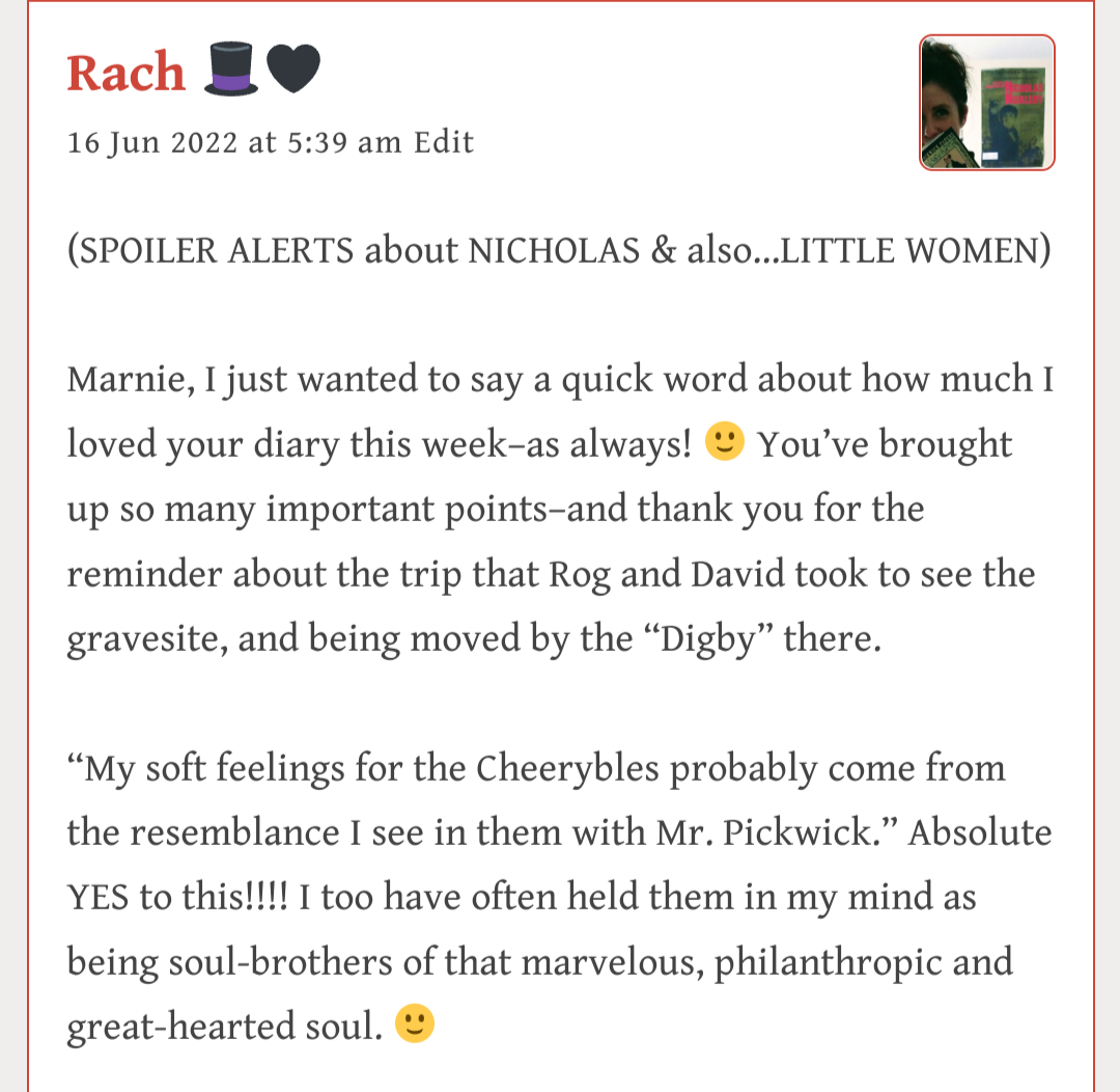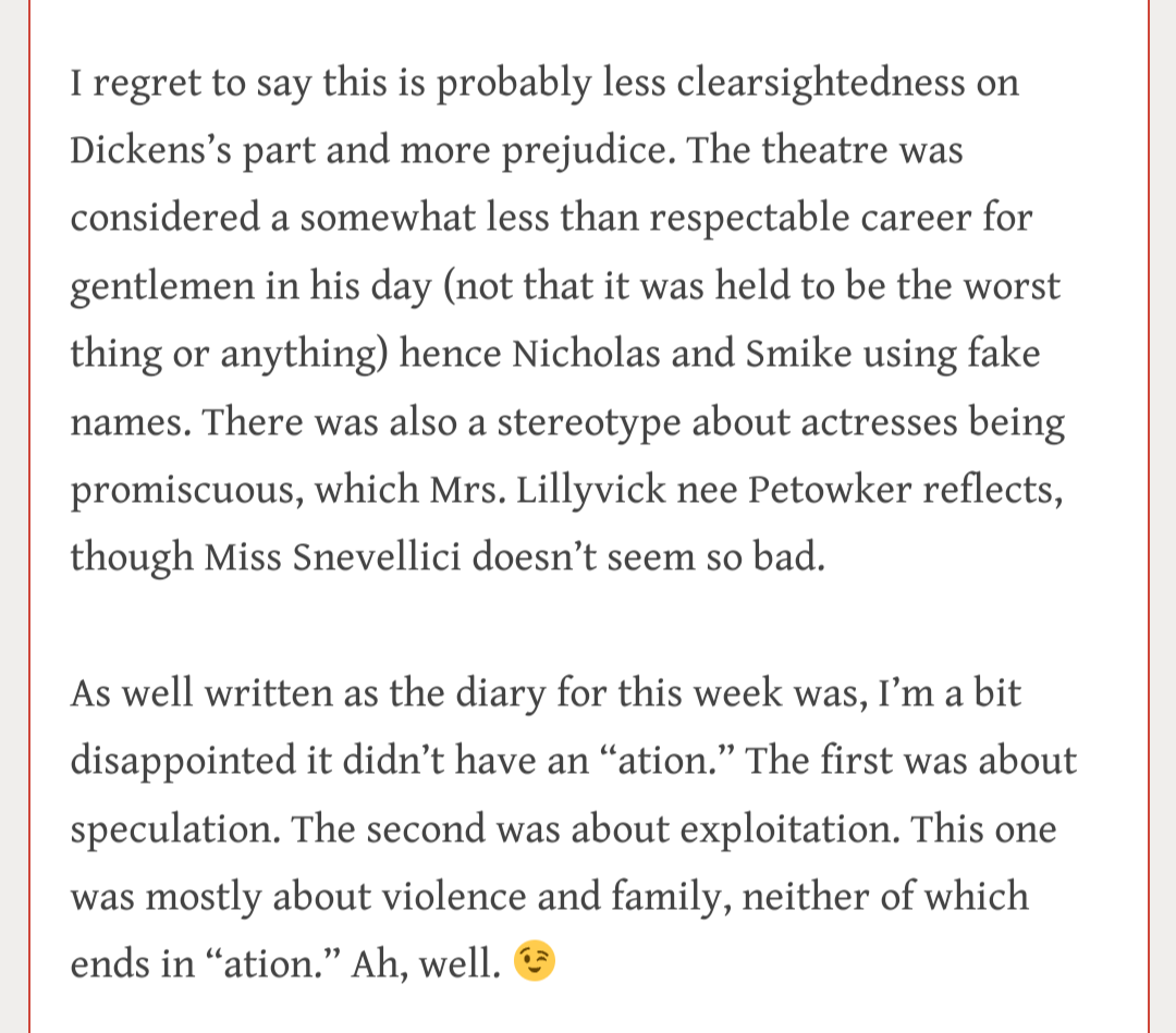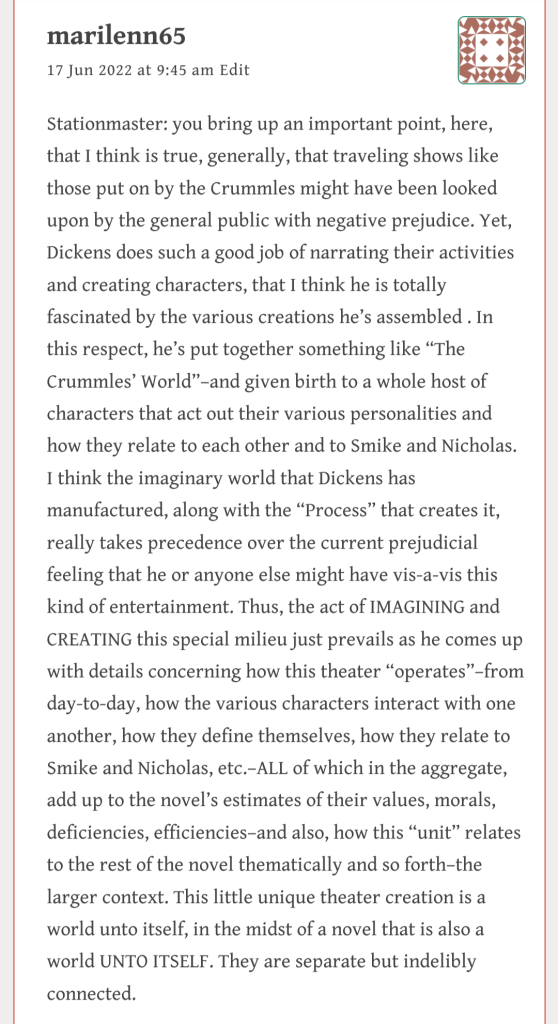To end off our wrap-up, Lenny’s response to Marnie’s Nickleby diary beautifully summarizes the kind of “close reading” that we’re all engaging in here: