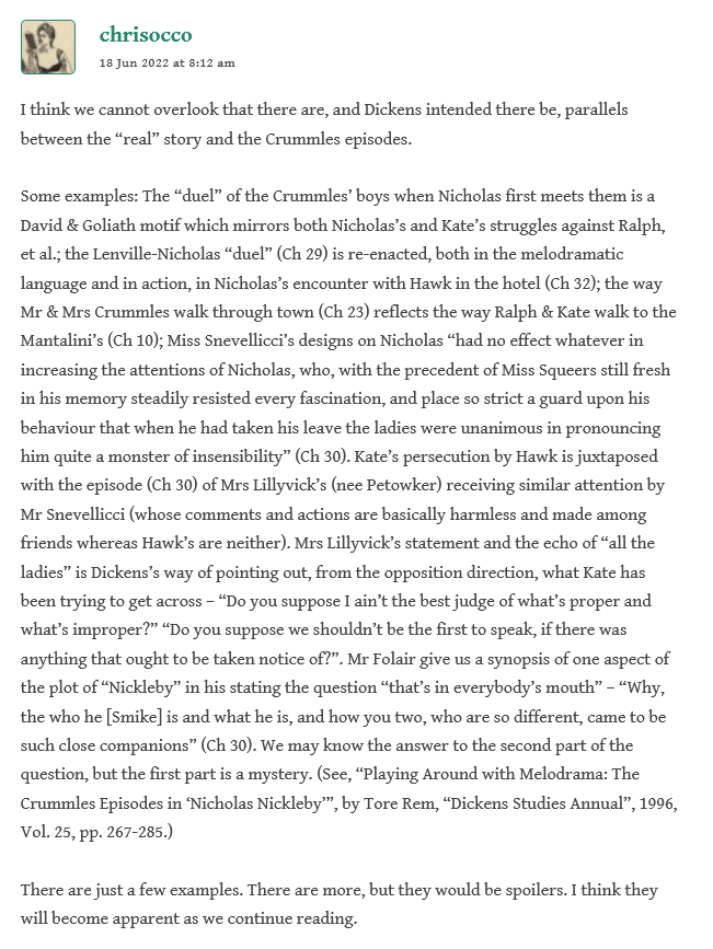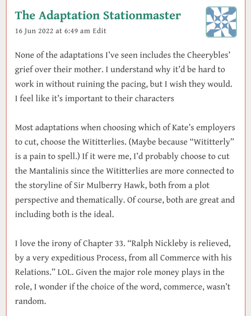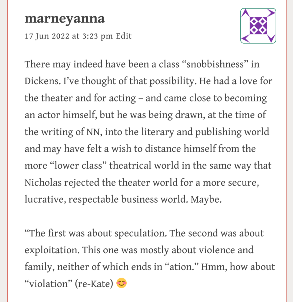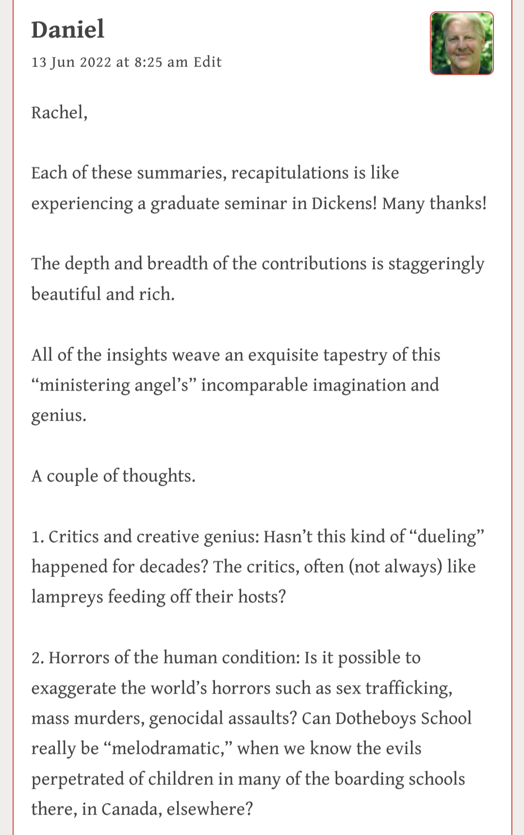 To end off our wrap-up, Lenny’s response to Marnie’s Nickleby diary beautifully summarizes the kind of “close reading” that we’re all engaging in here: