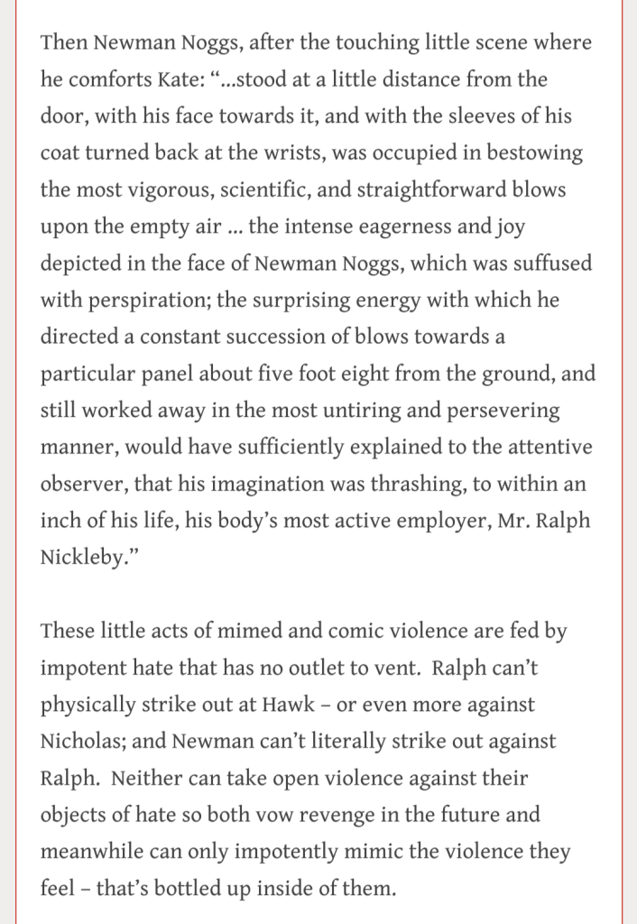 1. Impotence and repression: Dickens, of course, knew the experience of poverty and its repressive effect. He captures so deftly the specific experience of impotence in men–like Noggs angrily boxing at phantoms.