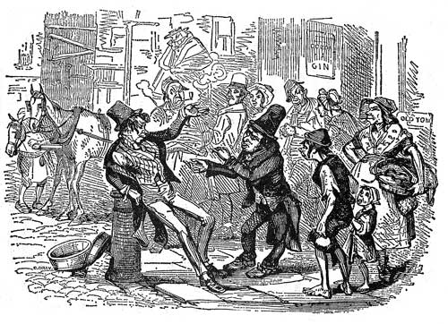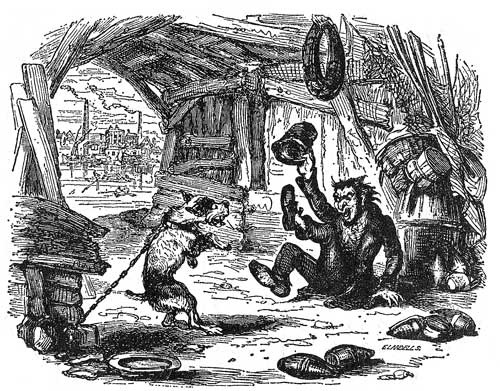 Quilp and Dick Swiveller enter the scene, and Quilp is suspicious about Kit’s newfound income. Quilp then uses Dick’s weakness for drink to weasel out of Dick the whole scheme about marrying Nell; Quilp agrees to help him, just for the cruelty of enjoying Dick’s eventual disillusionment about her “wealth.”