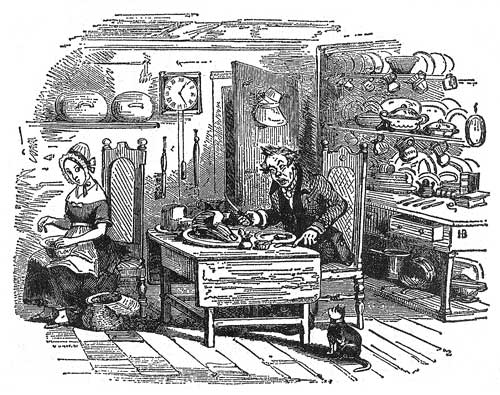 I’m really wondering just what Mrs Quilp sees in her husband (perhaps big things do come in small packages). Chapter 50 finds them at home, but by no means on congenial terms. Quilp leaves their shared home for his bachelor’s pad after the fallout from his premature wake. Mrs Quilp sobs at his departure and sobs again next day as she “earnestly” begs him to return home. Classic case of sadism and masochism – different strokes for different folks I guess.